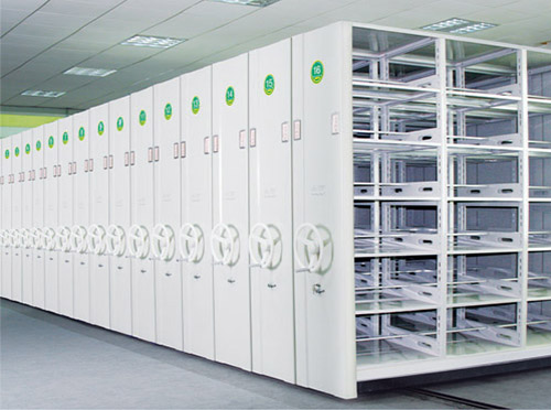 3、檔案資料存取:順時(shí)針或逆時(shí)針方向搖動(dòng)手柄,活動(dòng)架將在軌道上平穩(wěn)行走,架體移動(dòng)到一定位置時(shí),順時(shí)針轉(zhuǎn)動(dòng)兩列架體的自鎖柄到OFF位置時(shí),搖動(dòng)手柄,架體不能再移動(dòng),然后進(jìn)入架體間存取資料。