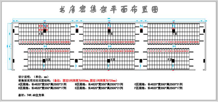 根據(jù)客戶前期提出的幾個(gè)要求,我司設(shè)計(jì)部與客戶溝通好后,根據(jù)書庫房間結(jié)構(gòu)結(jié)合客戶的需求設(shè)計(jì)了118列密集架,因房間柱子較多分6個(gè)團(tuán)體。